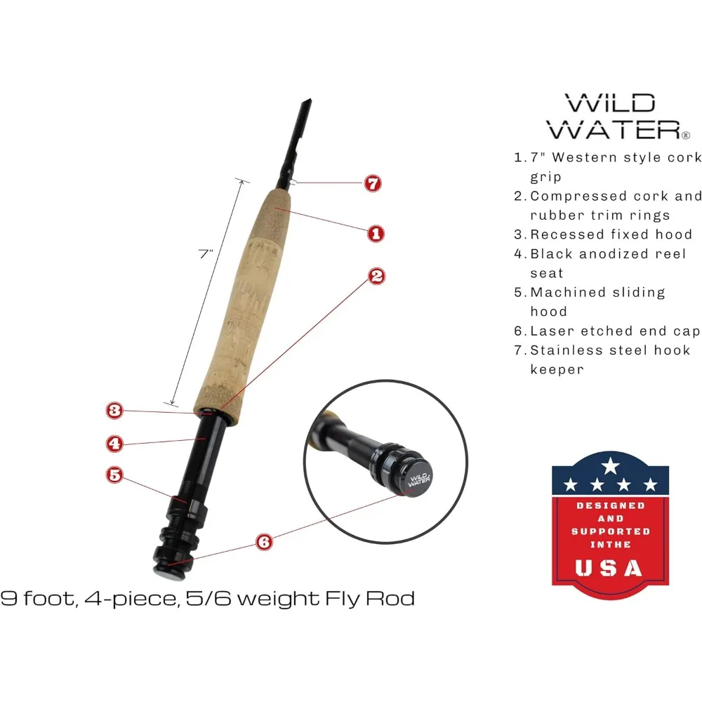 FLY ROD COMPONENTS: Weighing just 4.4 ounces, this well-crafted 9-foot fly fishing rod is made of durable and light IM8 matte black graphite. A high-quality reel seat, stainless steel stripper guide with silicon carbide rings and a laser-etched butt cap are also provided. For added grip and comfort, the rod is fitted with a 7 inch-long Western-style cork handle that comes with compressed cork and rubber trim rings.